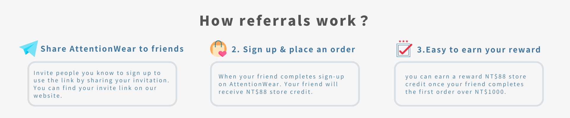 1.《New member》can sign up membership on AttentionWear website through your referral link. New member will earn NT$88 store credit after completing registration.