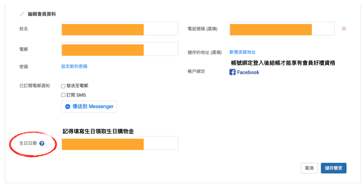 (FB登入之會員,請記得去我的帳號->個人資訊->生日日期補登生日才會得到生日購物金唷! )