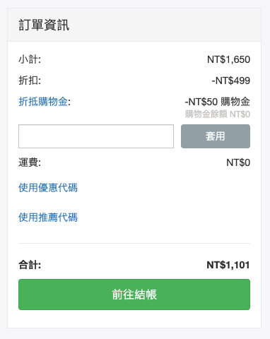 ►在結帳頁面訂單資訊欄座使用,折抵購物金欄會顯示本次可折抵的購物金額,您可以自行再做更改。