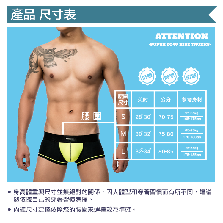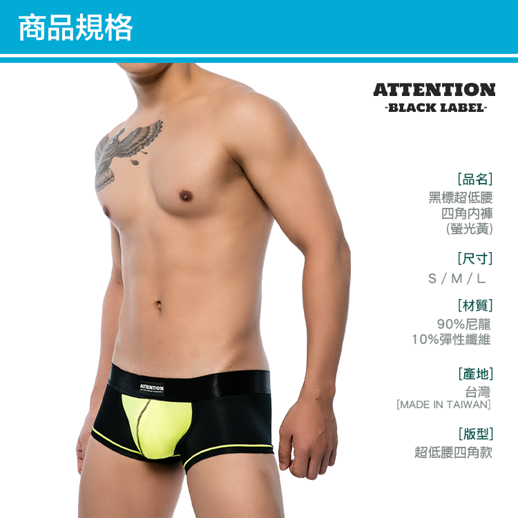 • 設計特色:本款使用1-1/4吋黑色亮光鬆緊腰帶,中央車縫限定ATTENT!ON品牌黑標,採用超低腰版型立體多片剪裁,內褲前側有囊袋剪裁設計,配色以螢光亮黃搭配低調霧黑色布料,褲腳則使用雙色車縫裝飾設計,霧黑色系的色彩搭配適合任何衣服。