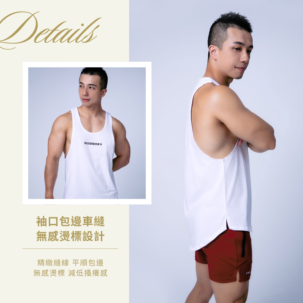 • 設計細節/ 黃金版型  精準肩峰剪裁點,凸顯寬肩視覺,側邊深開口,運動時肌肉輪廓一覽無遺,胸前領口下挖,巧妙展露挺立胸肌線條,圓弧下擺修飾身型,前低後高,優化身材比例曲線。